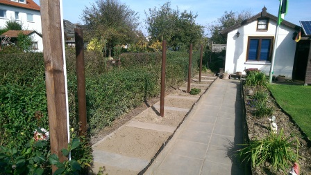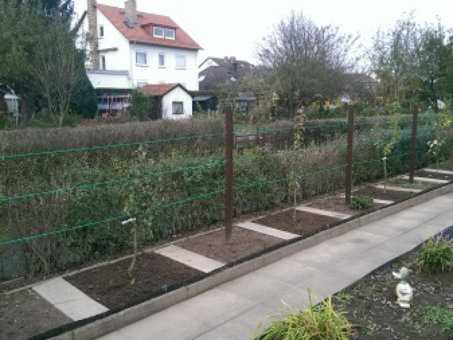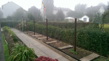 Nachdem die Bäume im Garten zu sehen sind, haben Jörg und Ich die ersten Schritte Richtung Spalierobst gemacht. Die Pflöcke sind gesteckt.