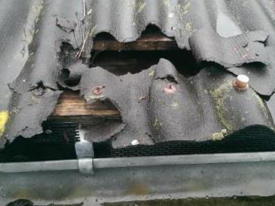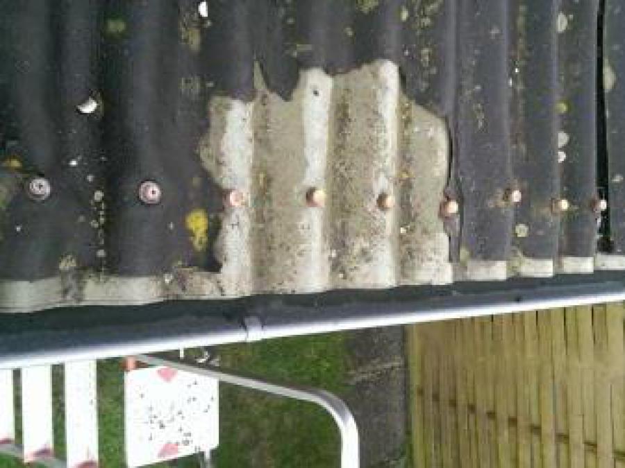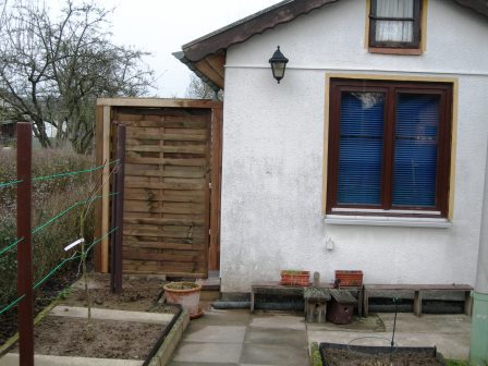 Heute morgen habe ich einen richtigen Schrecken bekommen. Ein Marder oder Waschbär hat sich wohl am Dach unserer Vorlaube tätig gemacht. Jörg und ich haben es kurzerhand geflickt. Aus dem alten Garten wurde eine Stück Bitumenplatte eingesetzt