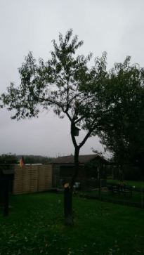 Der Apfelbaum ist auch bis auf den Stamm geschrettert und klein geschnitten.