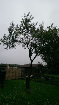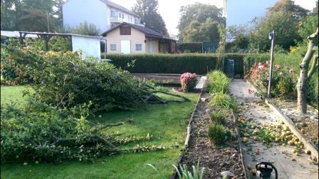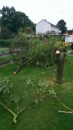 Heute ging es den Bäumen wieder an der Kragen. Der Pfirsichbaum ist bis auf den Stamm verschwunden und am ersten von zwei Apfelbäumen habe ich angefangen die Äste abzusägen.