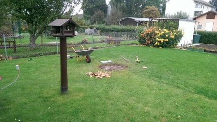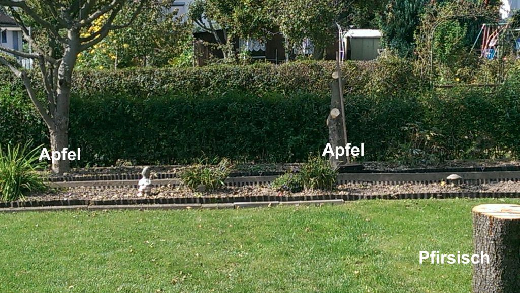 Jetzt hat der letzte Apfelbaum auch die Äste verloren. Am Pfirsischbaum bin fast verzweifelt. Solch ein hartes Holz habe ich noch nicht erlebt. Habe mich deshalb entschlossen die Wurzel im Rasen zu lassen. Den Stamm habe ich ca. 3cm unter der Rasenkante abgesägt.