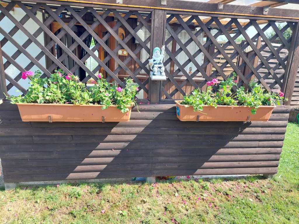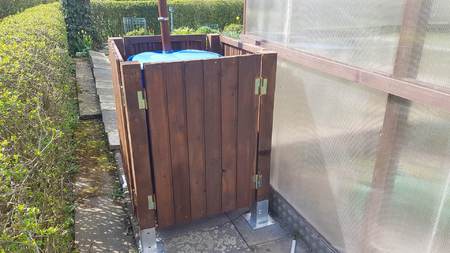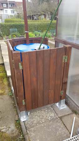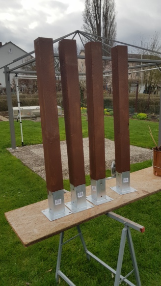 Die Pfosten für die Verkeidung des Wasserfaßes am Gewächshaus sind mit den Aufschraubhülsen vereint und gestrichen.
