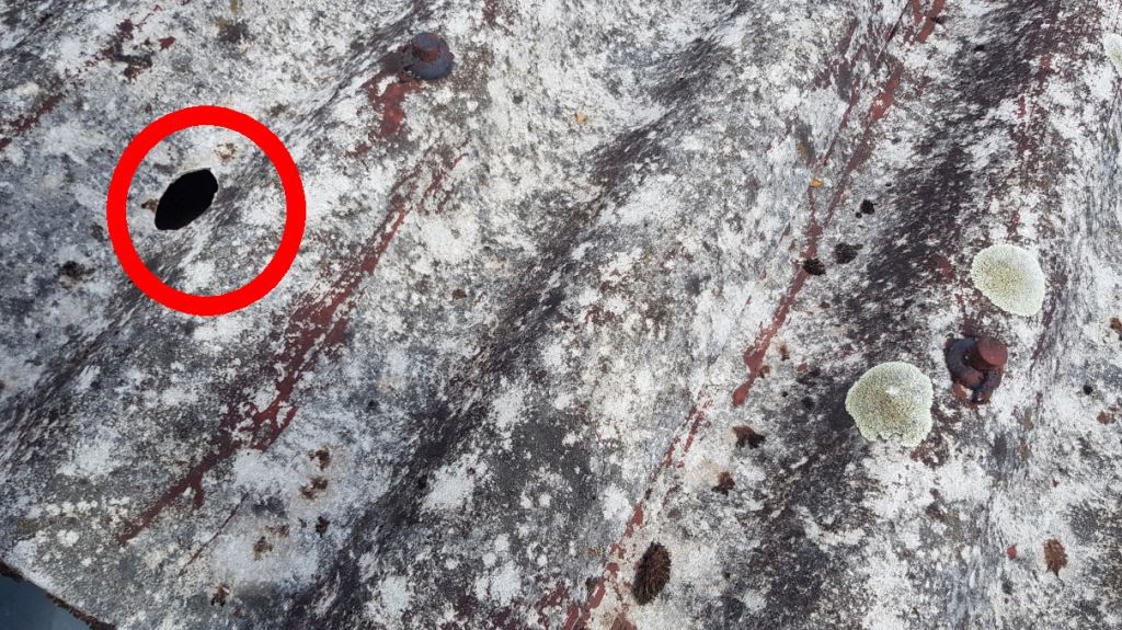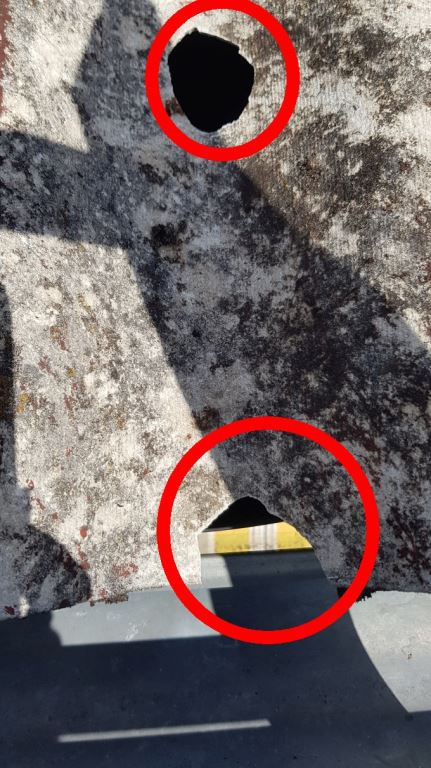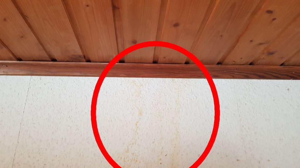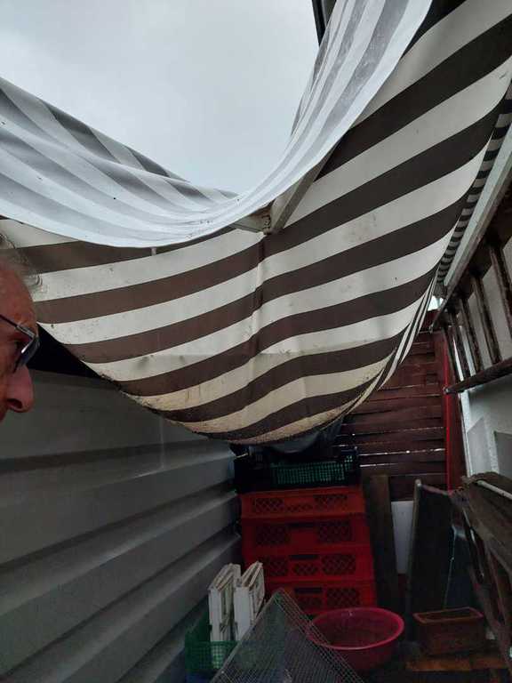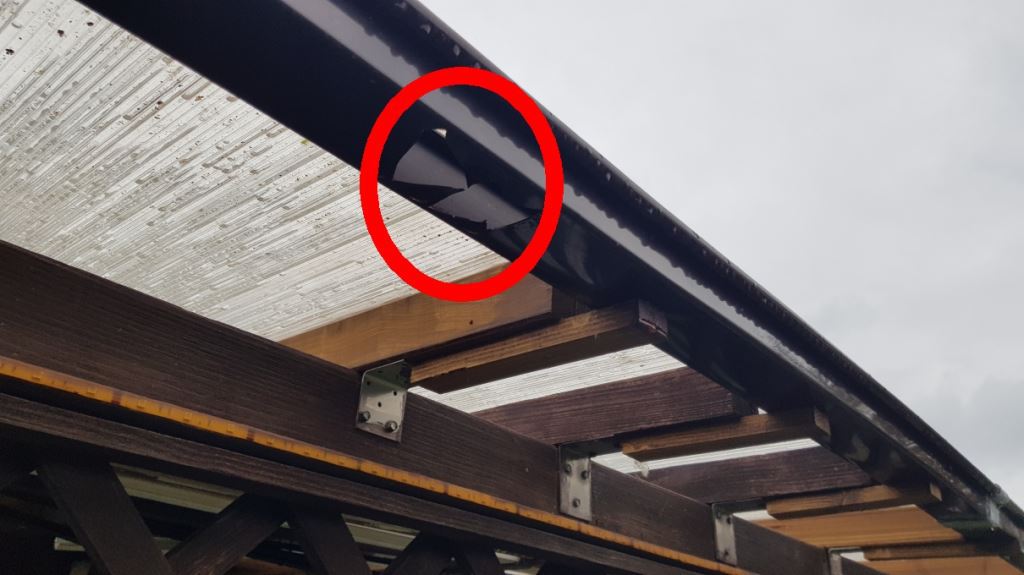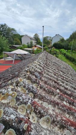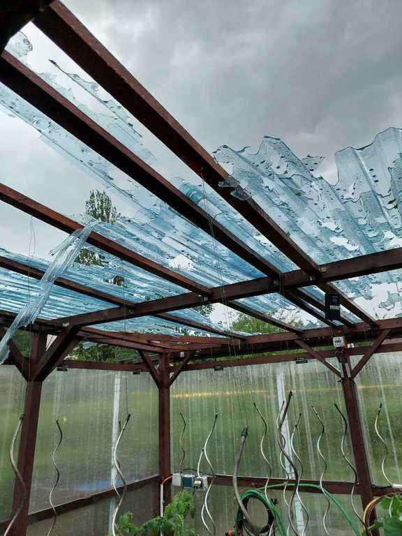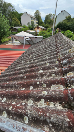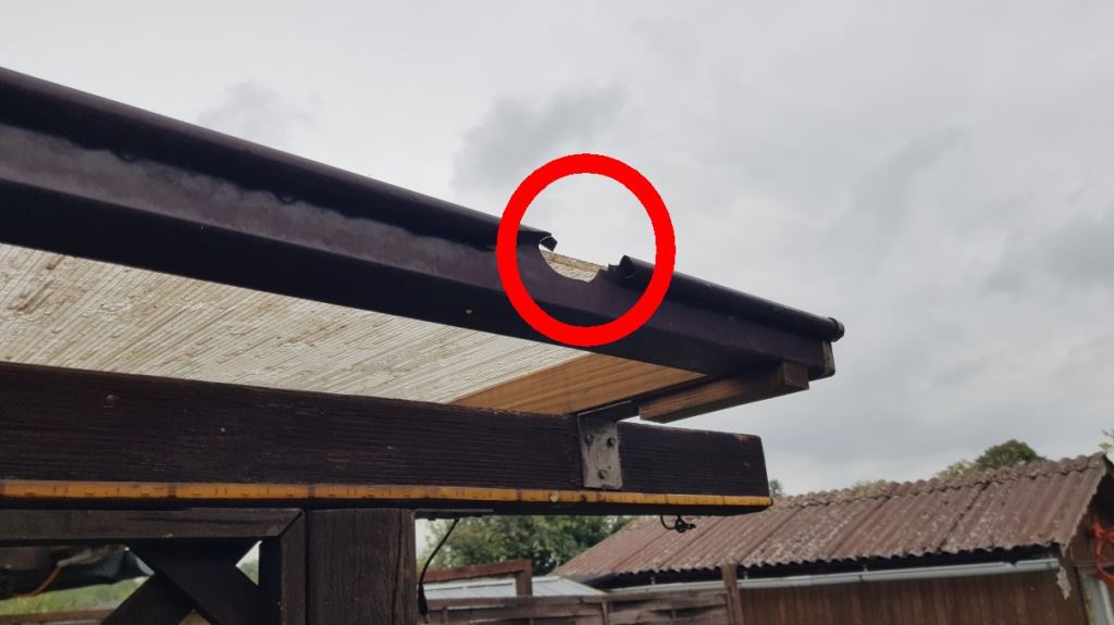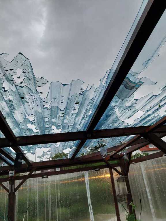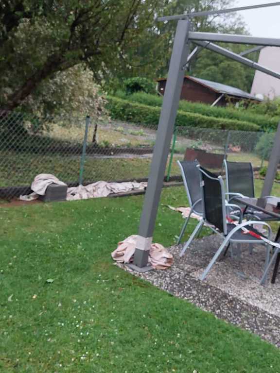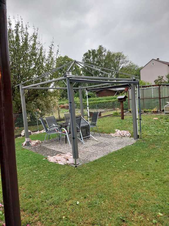 Als wir am 28.06.2023 nachmittags aus dem Urlaub kamen, habe ich mich sofort mit Jörg im Garten getroffen. Er zeigte mir wo auch Wasser in die Laube gelaufen ist. Da konnte ich gleich mal schauen wo das Wasser durch das Dach gedrungen ist. Ich hoffte nur das das Ethernit-Dach noch in Ordung geblieben ist. Aber die Hoffnug konnte ich begraben. 6 Golfball große Einschlage konnte ich entdecken, des weiteren ist die Dachrinne kaputt sowie das Typhoon der Sat-Anlage. Inder Laube ist das Wasser durch das Dach an der Wand herunter gelaufen.