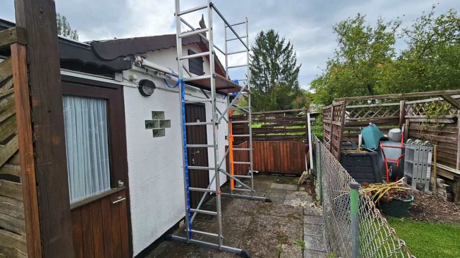 Die Vorarbeiten zum erneuern des Daches der Laube sind abgeschlossen. Das Gerüst steht um die Eternitplatten sicher zu demontieren. Jetzt benötige ich nur noch stabiles Wetter um das Dach zu öffnen und das vorgesehene Blechdach in Ziegeloptik zu verbauen.