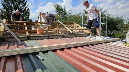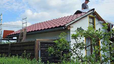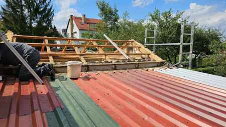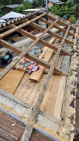 Heute wurde angefangen die Ethernit-Platten zu entfernen. Dabei stellten wir fest, das die Platten mit Steinen und Putz zwischen Dach und Hauswand abgedichtet wurde. Diesen Putz und die Steine mußten entfertn werden, damit der Dachstuhl komplett frei liegt und die Dachziegelblechplatten sachgerecht verlegt werden konnten.